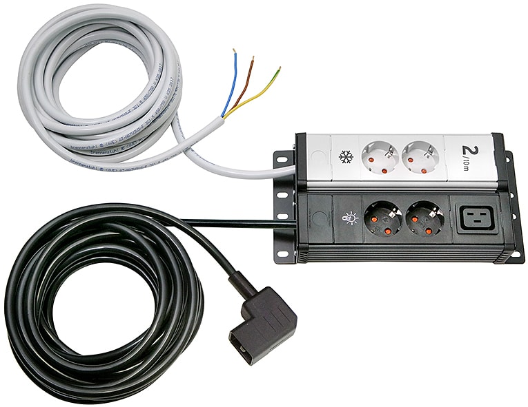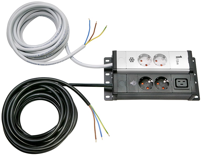 Die Steckerleisten verfügen über 2 räumlich getrennte Stromkreise: grau = Dauerstrom, schwarz = Lichtstrom.